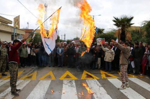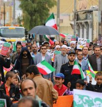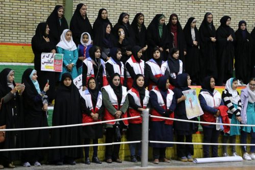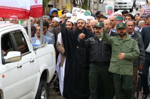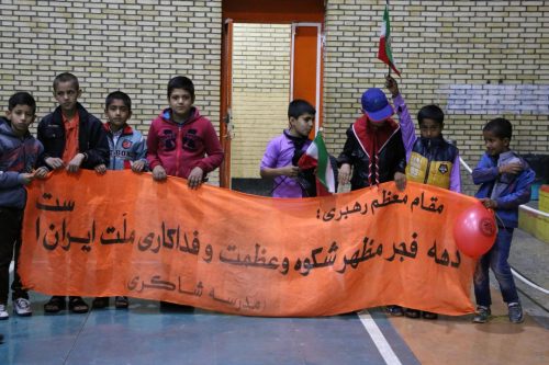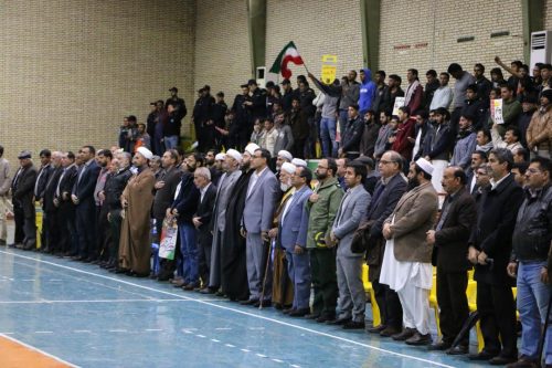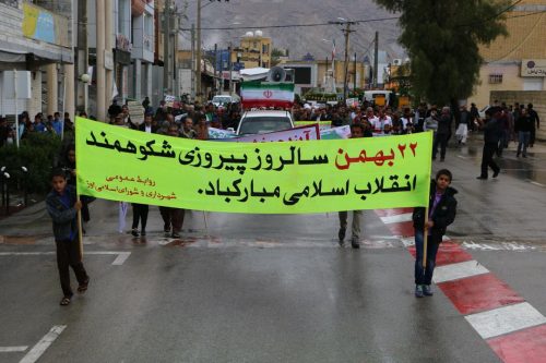 مرگ بر امریکا، مرگ بر اسرائیل، ۲۲ بهمن یوم الله است، مرگ بر ضد ولایت فقیه و… از جمله شعارها بود. در جلو سالن ورزشی پرچم آمریکا و اسرائیل به آتش کشیده شد، سپس شرکت کنندگان در سالن ورزشی میراحمدی تجمع کردند.