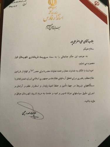 در پایان این جلسه حکم انتصاب علی اصغر علی پور به عنوان سرپرست فرمانداری شهرستان از که از سوی عنایت الله رحیمی استاندار فارس صادر شده، توسط مدیر کل امنیت استانداری فارس و امام جمعه اوز به وی تقدیم شد.