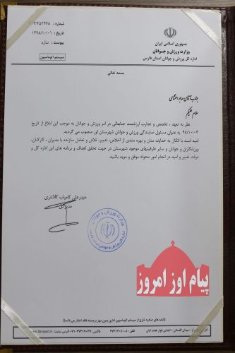 بانام ویادایزد یکتا خدمات آشکار ومدیریت قوی وبااقتدار ِ نزدیک به یک دهه جناب سیدحسینی عزیز قابل تقدیر وستایش می باشد.سید با توجه به اینکه تا مدت هاموفق به دریافت حکم مدیریتی نبودند اما به خاطرعشق وعلاقه به ورزش وداشتن حس مسئولیت پذیری ذاتی ورزشکاری وعهد به وفا به عمل بدون هیچ چشمداشتی سنگرورزشگاه را رها نکرد.شایستگی واعتبارحضرتعالی با اتمام یک مسئولیت پایان پذیر نخواهدبود سربلندی وسعادت روزافزونتان همواره از پروردگار خواستارم