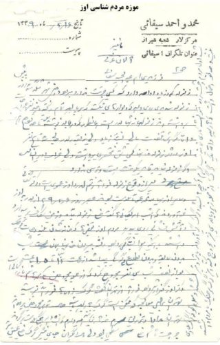 دیگر جز سلامتی شما مطلبی در نظر نیست. والدهات، هما، رابعه، طیبه سلام میرسانند. شریف و امین سلام میرسانند. عبدالرحیم رفته است اوز، عموییات در اثر زلزله که مرتب میآید نمیتوانند برود لار. خانه متضرر شدیم. خانه لار خراب و آنچه مال التجاره داشتیم همه از بین میرود زیرا بعضی ها مرد اند و بعضی هم متفرق شدهاند هنوز معلوم نیست که کی مرده و کی در حیات است. خلاصه لار تا پنجاه سال دیگر لار نمیشود. دستور دادهاند که بعدها ساختمان رو بطرف خور و براک ببرند و شهر قدیم اصلاًمتروکه شود.