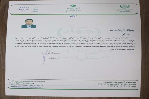 پس از قرائت حکم انتصاب حسین وطن دوست به عنوان سرپرست جهاد کشاورزی شهرستان اوز توسط مهندس ارغون مشاور مدیرکل استان و تاکید بر اجرای برنامه های وزارت جهاد کشاورزی حکم و پیوست آن تقدیم شد.
