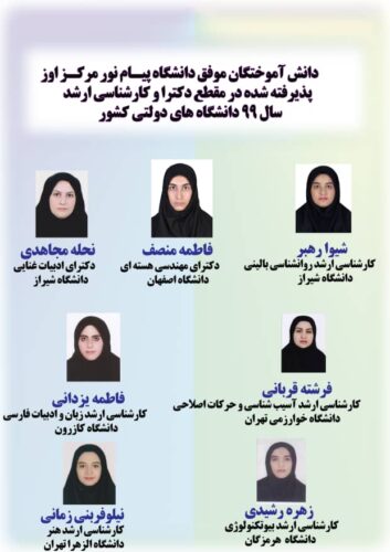 خانم نیلوفر بنی زمانی (کارشناسی مدیریت دانشگاه پیام نور اوز) کارشناسی ارشد هنر دانشگاه الزهرا تهران