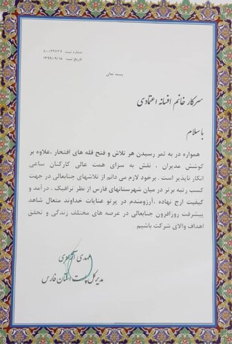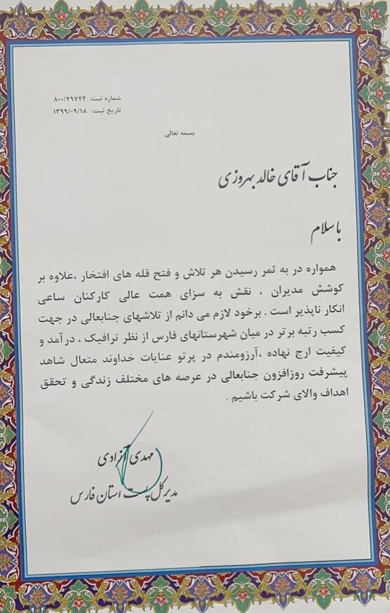 مهدی آزادی مدیر کل پست استان فارس از افسانه اعتمادی سرپرست اداره پست اوز و خالد بهروزی از کارکنان باسابقه این اداره، به دلیل کسب رتبه برتر میان شهرستان های فارس تجلیل کرد.