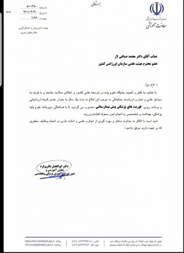 دکتر ابوالفضل باقری فرد؛ معاون آموزشی و دبیر شورای آموزش پزشکی و تخصصی وزارت بهداشت ودرمان و آموزش پزشکی، دکتر محمد صباغی را عنوان عضو کمیته ارزشیابی و برنامه ریزی فوریت های پیش بیمارستانی منصوب کرد.