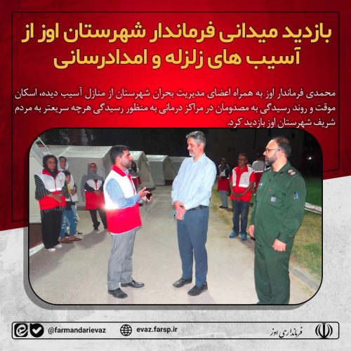 پس از جلسه ستاد مدیریت بحران شهرستان، محمدی فرماندار اوز از مناطق زلزله زده شهر اوز بازدید کرد. این بازدید که چند ساعت به طول انجامید به همراه اعضای مدیریت بحران شهرستان از منازل آسیب دیده، برپایی چادر برای اسکان و روند رسیدگی به مصدومان در مراکز درمانی به منظور رسیدگی هرچه سریعتر به مردم شریف شهرستان اوز انجام شد.