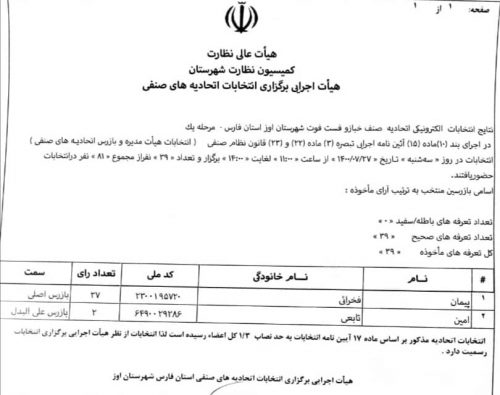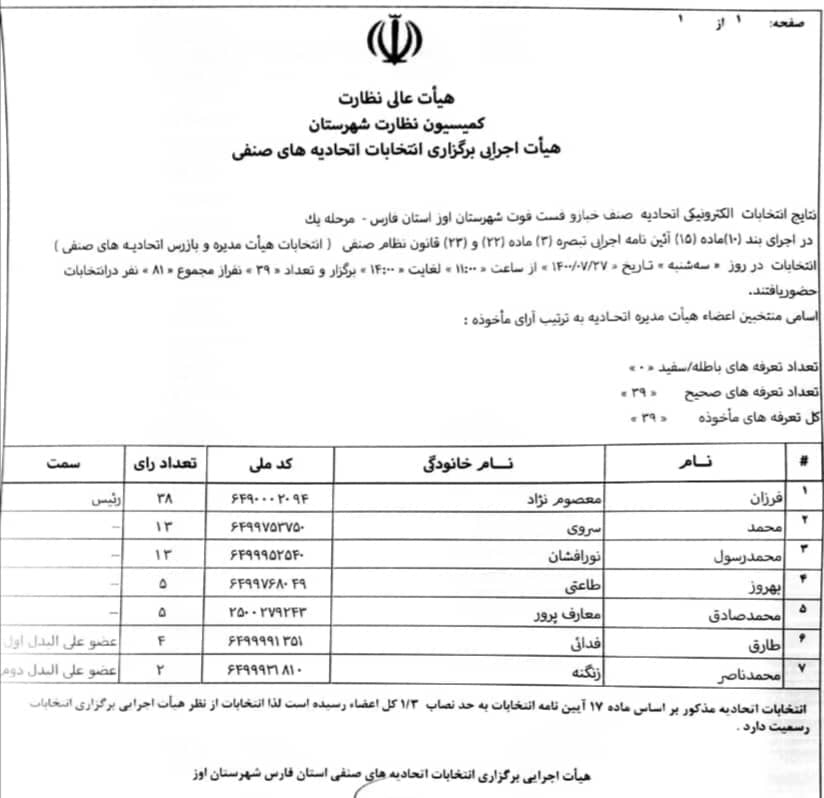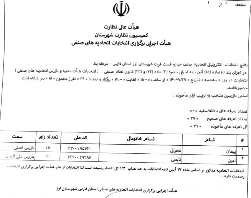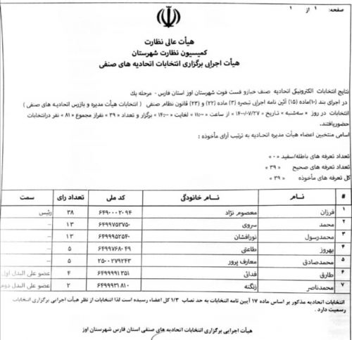همچنین امین تابعی با حدنصاب ۲ رای بعنوان علی البدل بازرس اتحادیه انتخاب شد.